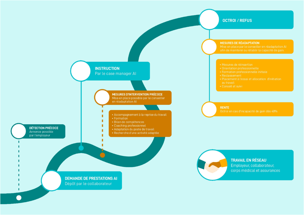 - Un dépliant avec des informations pratiques sur l’AI ainsi que le parcours de l’assuré