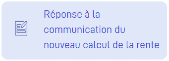 Suite à votre demande de nouveau calcul de votre rente AVS après l’âge de référence, vous avez reçu une communication de notre part vous informant du nouveau montant de votre rente. Votre réponse (oui/non) à cette communication peut nous être transmise au moyen de la e-démarche ci-dessous.